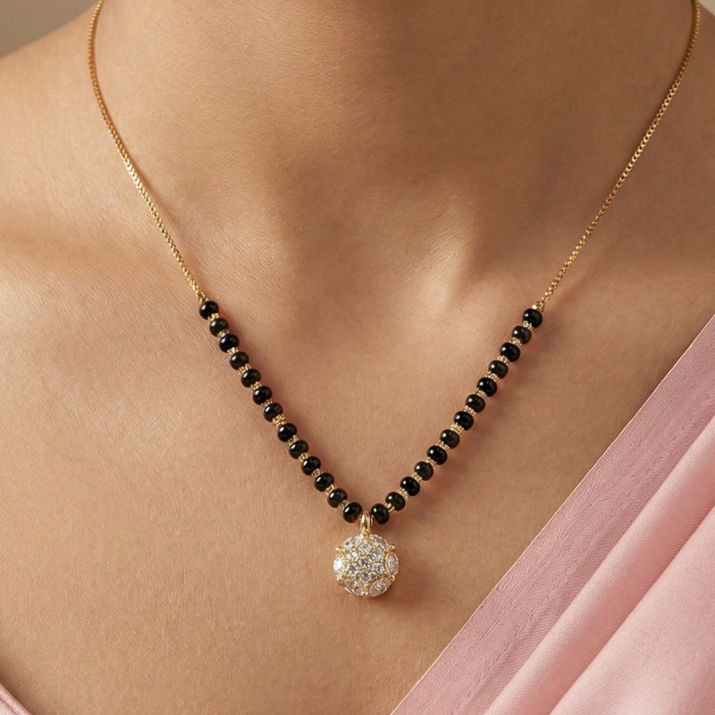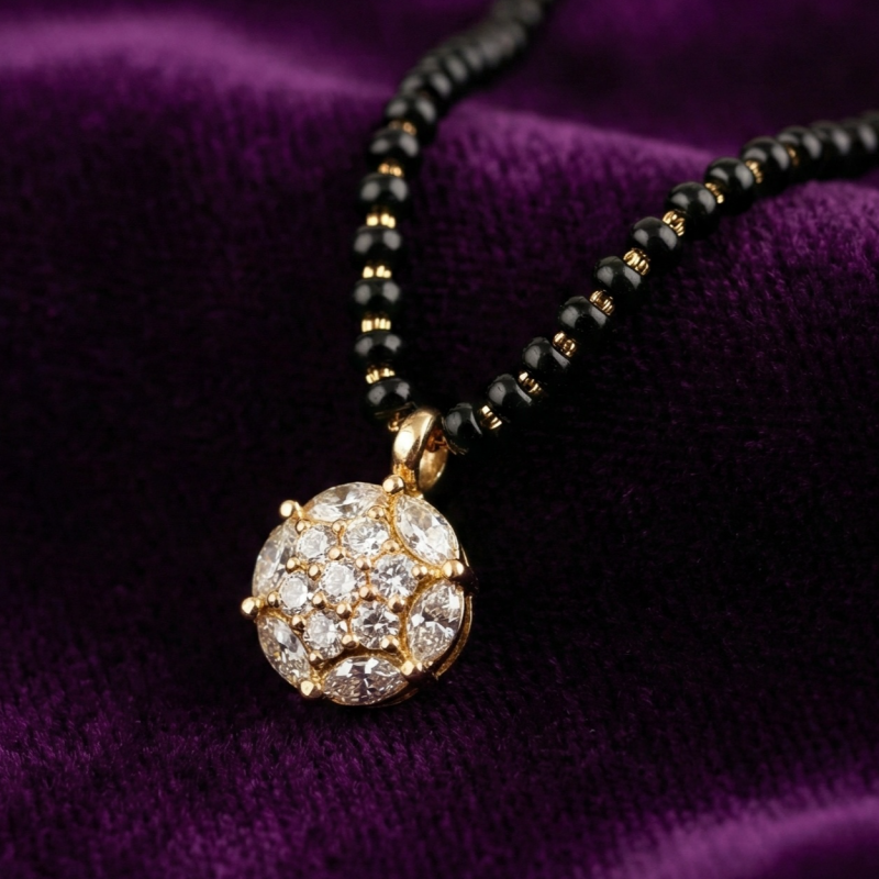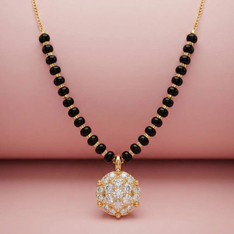 Sneh Sutra is inspired by the gentle warmth of love that grows stronger with time. The black beads symbolize protection and balance, while the subtle sparkle of American diamonds represents joy and positivity. With its elegant 99.9 gold polish, this mangalsutra beautifully blends emotional depth with graceful design.