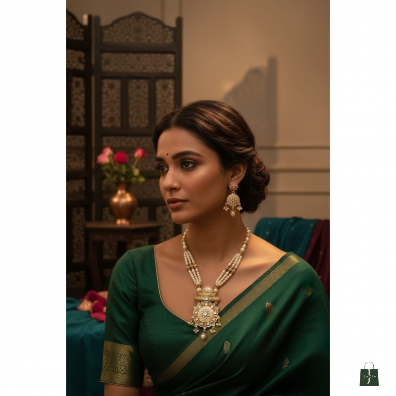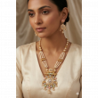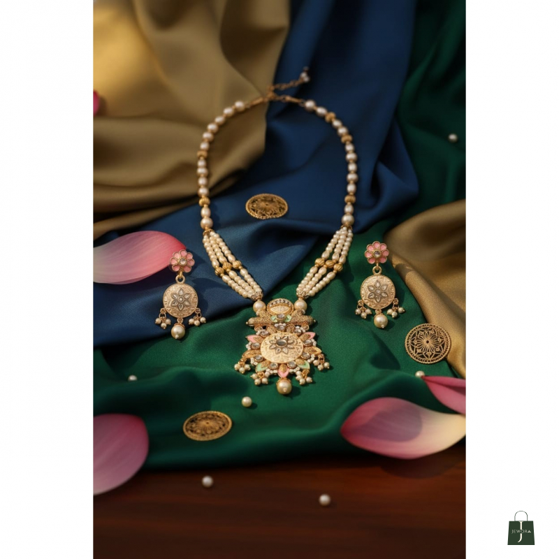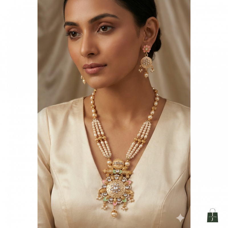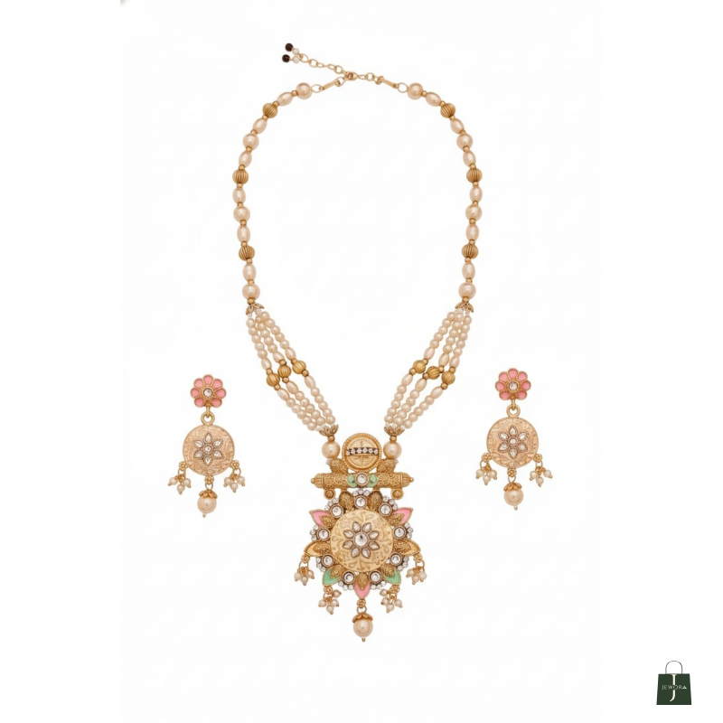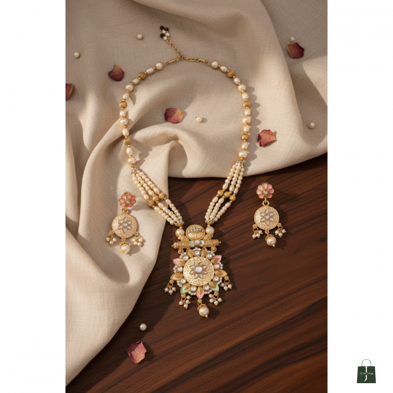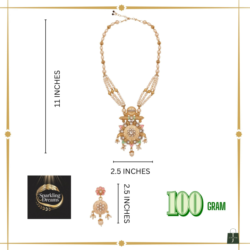 Sparkling Dreams Elegant Pastel Pink Mandala Rani Haar with Gold-Beaded Pearl Chain