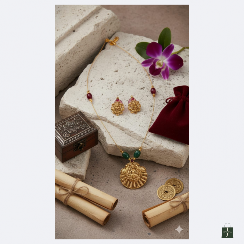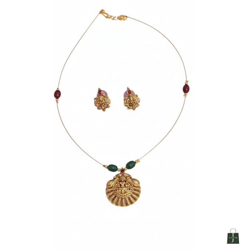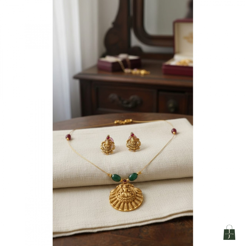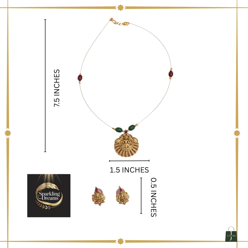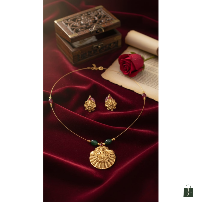 DIVINE TEMPLE ARTISTRY: This exquisite necklace set features a highly detailed, antique gold-plated pendant of Goddess Lakshmi seated on a lotus. The intricate craftsmanship captures the essence of traditional South Indian temple jewelry, making it a symbol of prosperity and grace. MODERN MINIMALIST DESIGN: Unlike heavy traditional necklaces, this pendant floats on a unique, ultra-thin flexible wire chain. This contemporary design keeps the focus entirely on the deity pendant and the deep emerald-green beads, offering a lightweight and comfortable wearing experience for long hours.