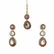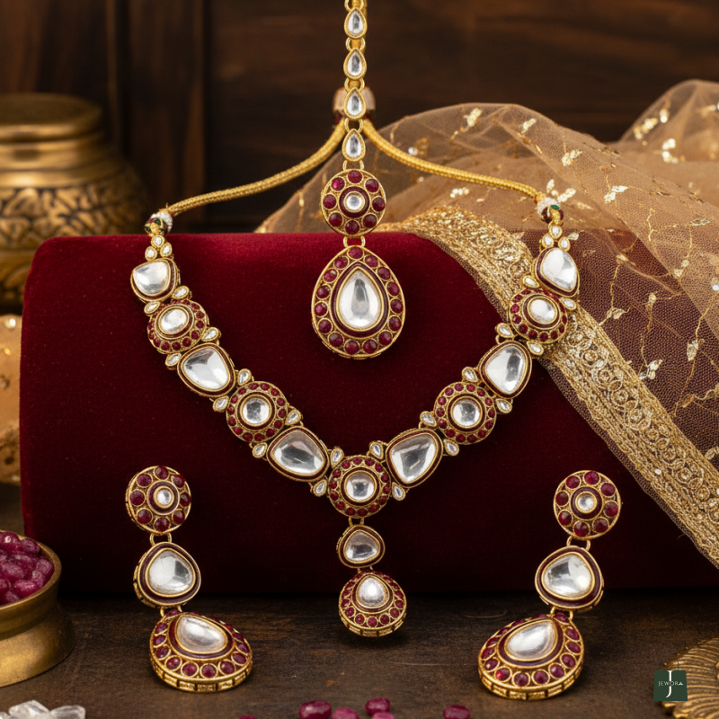 COMPLETE BRIDAL SET: Exquisite 3-piece Kundan jewellery set includes an adjustable choker necklace, matching dangle earrings, and traditional maang tikka for a coordinated bridal look