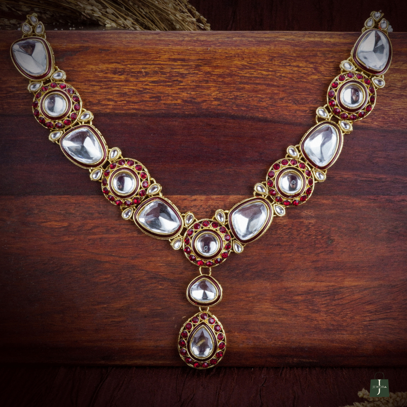 TRADITIONAL CRAFTSMANSHIP: Authentic Indian ethnic jewellery showcasing intricate Kundan work with alternating patterns of clear crystal stones and rich maroon accents perfect for weddings and festivals