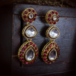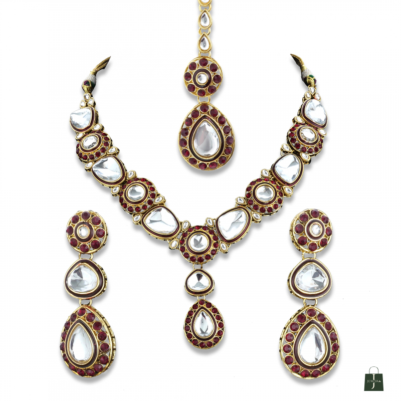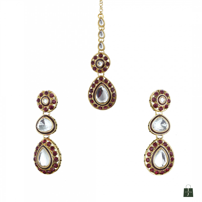 ELEGANT DESIGN: Features stunning teardrop and circular motifs adorned with white Kundan stones and maroon gemstones set in luxurious gold-tone metal for a classic Bollywood-inspired aesthetic