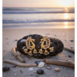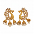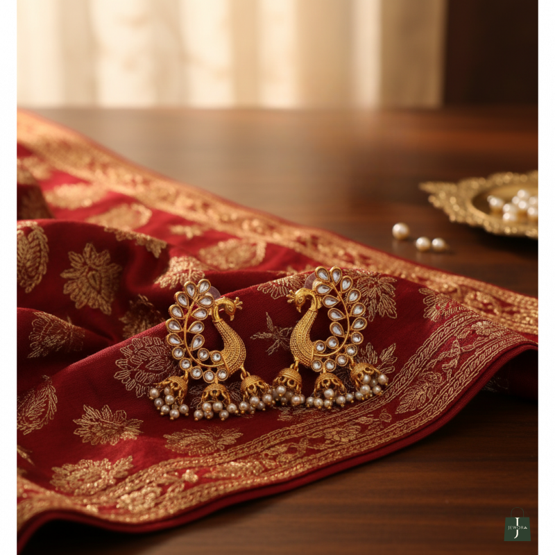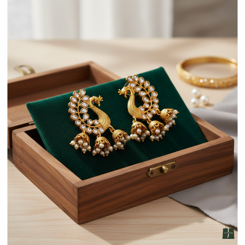 Elevate Your Ethnic Elegance with the Timeless Beauty of Peacock Jhumkas Add a touch of royal heritage to your jewelry collection with these Handcrafted Peacock Kundan Jhumka Earrings. Inspired by the majestic beauty of the Indian peacock and the grandeur of ancient temple jewelry, these earrings are designed for the woman who loves to make a statement. Artistry in Every Detail Each pair features a beautifully arched peacock silhouette, accented with shimmering white stones that catch the light at every angle. Below the intricate stud sits a classic bell-shaped Jhumka, decorated with tiny, dangling pearls that add a soft, feminine touch and a graceful sway to your movements. Versatile Style for Every Occasion Whether you are the bride, a bridesmaid, or a guest at a festive celebration, these earrings are your go-to accessory. They bridge the gap between Antique Traditional and Contemporary Ethnic, making them suitable for: Weddings & Engagements Religious Ceremonies & Festivals Bollywood-Themed Parties Formal Family Gatherings Quality You Can Trust We understand that jewelry is an investment in your style. Our earrings are finished with a high-shine gold plating that maintains its luster over time. To ensure longevity, we recommend keeping them away from water, perfume, and harsh chemicals. Store them in the provided airtight pouch when not in use. Package Includes: 1 Pair of Peacock Jhumka Earrings.