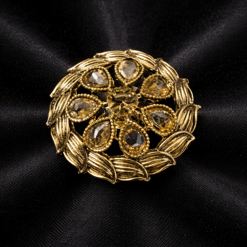 A stunning gold-toned ring with sparkling yellow gemstones arranged in a petal design. The centerpiece features a round golden stone, framed by intricate filigree detailing on the metallic base. Perfect for adding vintage elegance to any outfit.
