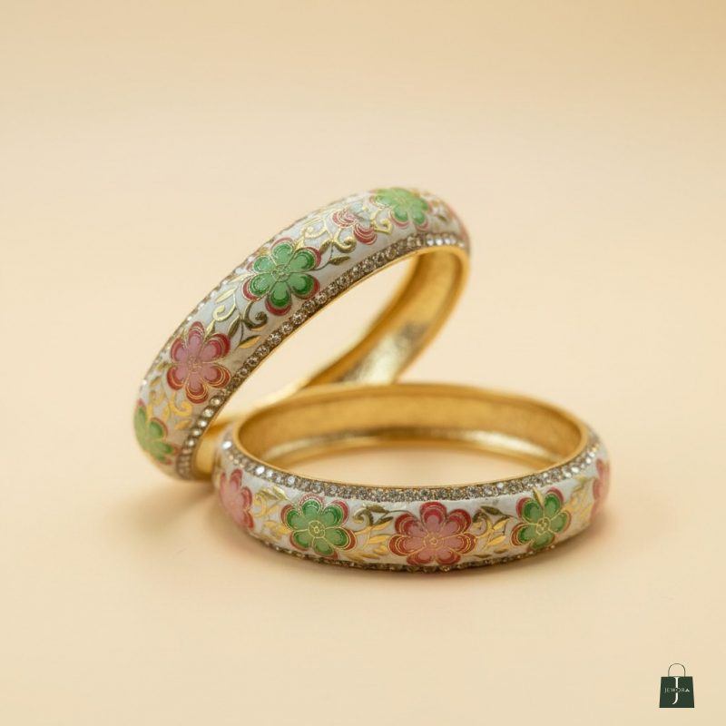 • Intricate Meenakari Work: The smooth, white enamel base is beautifully hand-painted with charming floral motifs in fresh green and soft coral pink hues.