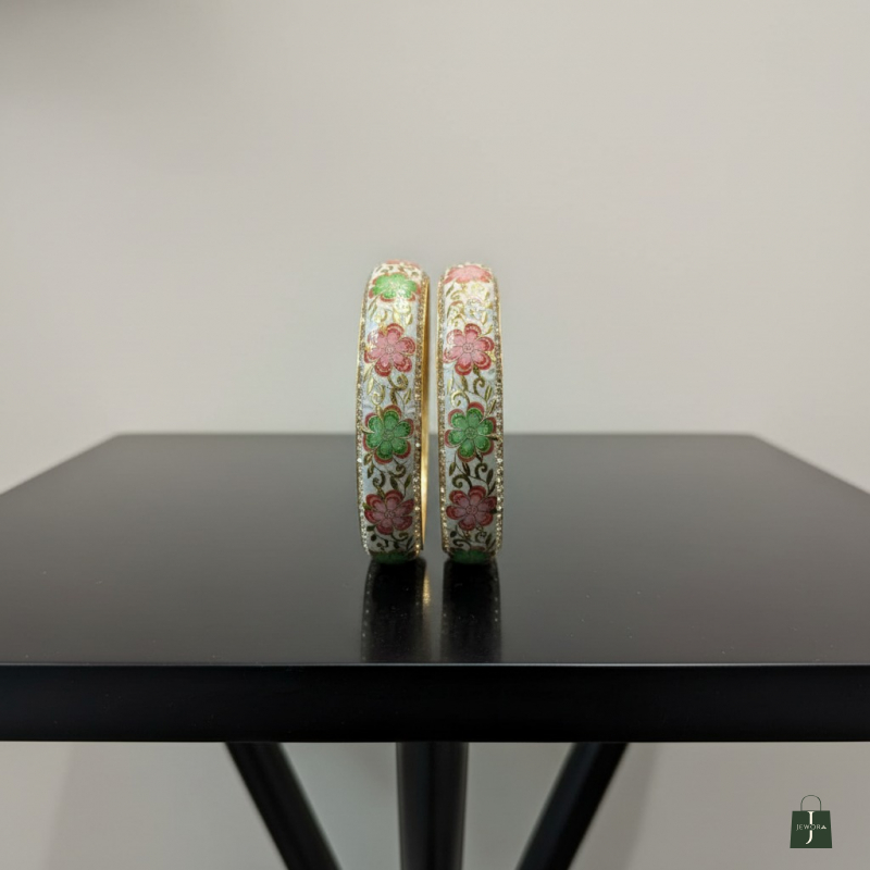 Intricate Meenakari Work: The smooth, white enamel base is beautifully hand-painted with charming floral motifs in fresh green and soft coral pink hues.