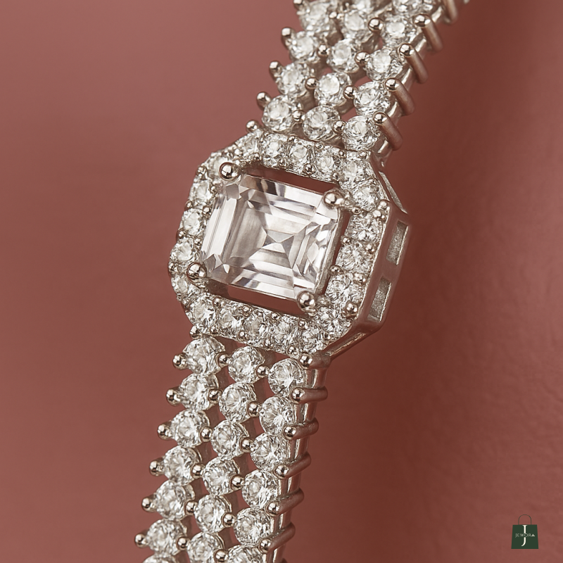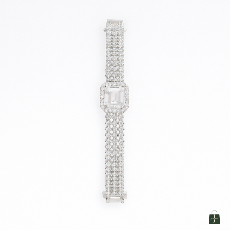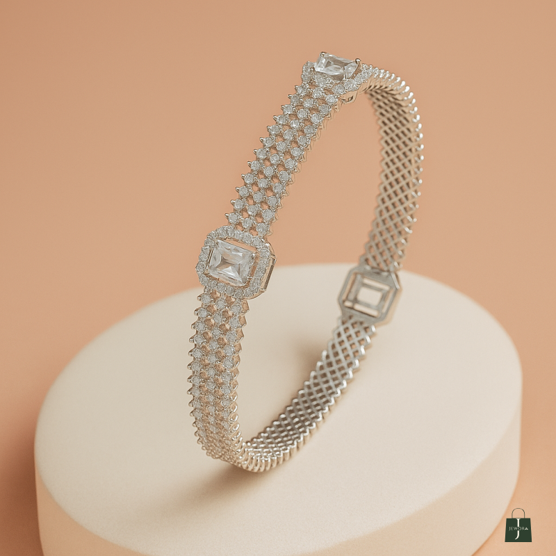 The Square Solitaire AD Bangle is a dazzling statement piece crafted for women who love refined luxury with a modern twist. Finished with a brilliant silver polish, the bracelet features bold square-cut American Diamond (CZ) solitaires as its centerpiece, set within intricate pavé-studded bands that shimmer with every movement. The sleek geometric design highlights sophistication and elegance, making this bracelet perfect for special occasions, glamorous parties, or wedding functions. Crafted from durable alloy, the bracelet offers both strength and lightweight comfort, ensuring it can be worn for extended hours without compromising on style. Its versatile design pairs effortlessly with traditional attire such as sarees, lehengas, or anarkalis, as well as with chic western ensembles like cocktail gowns and evening dresses. A single-piece masterpiece, the Square Solitaire AD Bracelet is an ideal accessory for those who prefer bold and elegant jewelry that leaves a lasting impression. Add it to your collection to elevate your festive and party looks with unmatched brilliance.