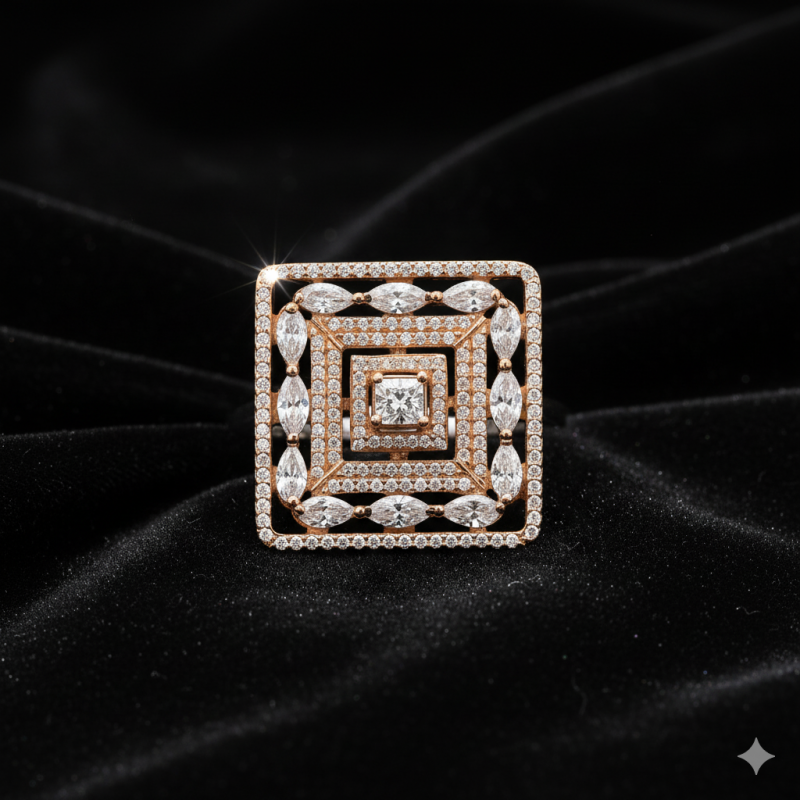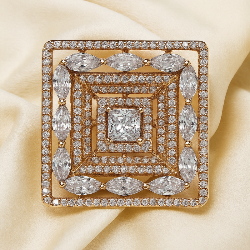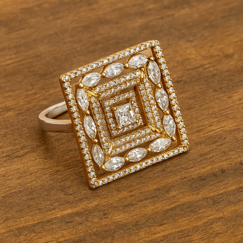Square Solitaire AD Cocktail Ring is a glamorous statement piece that reflects modern elegance and timeless appeal. Designed in a bold square frame, the ring features a central solitaire stone surrounded by concentric layers of sparkling American Diamonds (CZ) in both round and marquise cuts. The intricate arrangement and layered detailing make this ring a luxurious addition to any festive or bridal look.