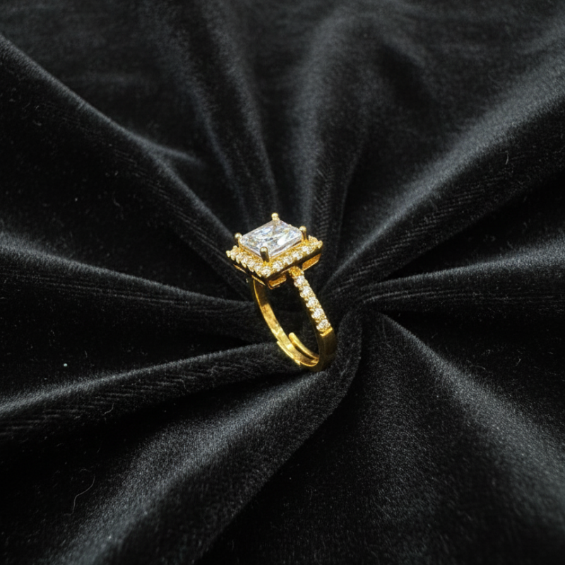 Square Solitaire Ring is a stunning statement piece featuring a brilliant square-cut American Diamond (CZ) at its center, framed by a halo of smaller sparkling stones. The gold-polished band is also encrusted with delicate CZs, giving this ring an exquisite brilliance from every angle. This ring is ideal for parties, engagements, or gifting, offering the perfect blend of luxury and modern design. Its bold yet elegant look makes it stand out while being versatile enough to pair with ethnic wear or western outfits. Lightweight and adjustable, it is designed for women who love timeless sparkle with a contemporary twist.