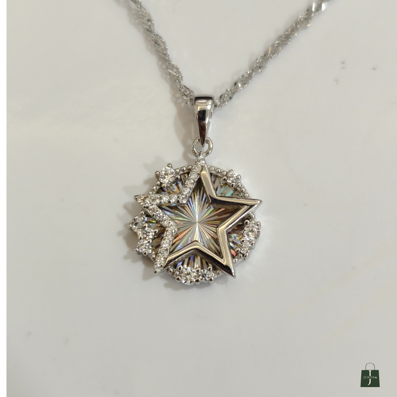 A dazzling star-shaped pendant surrounded by sparkling CZ stones. Designed to reflect brilliance and elegance with every movement. Ideal for gifting and statement styling.