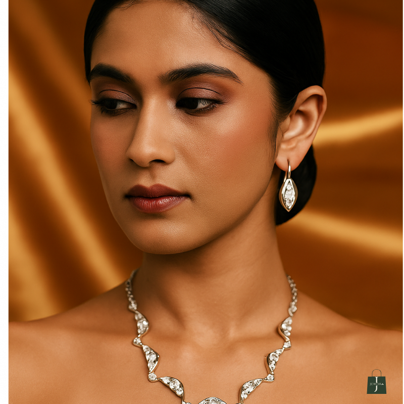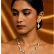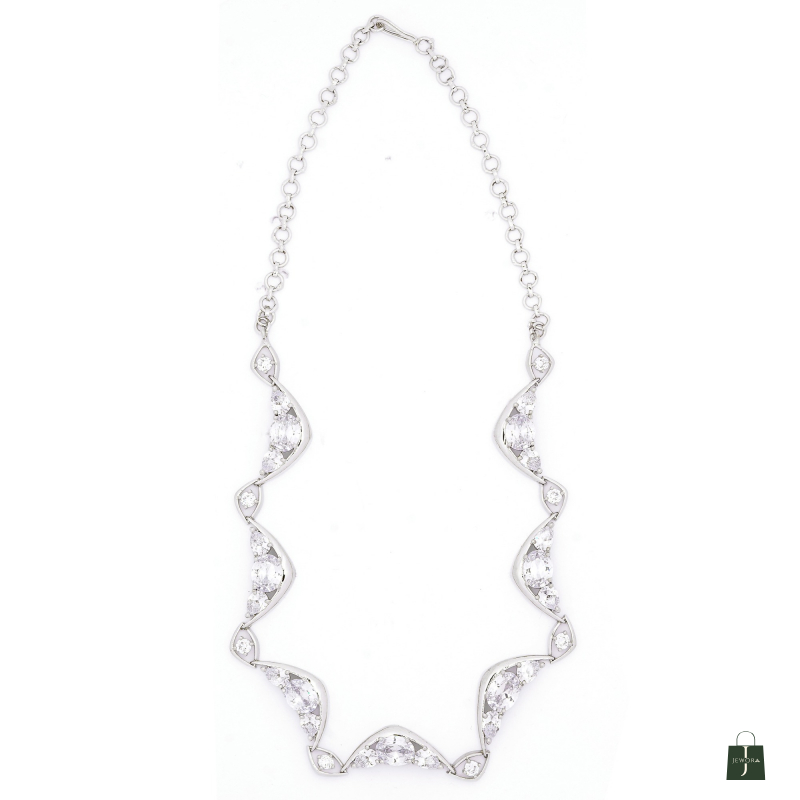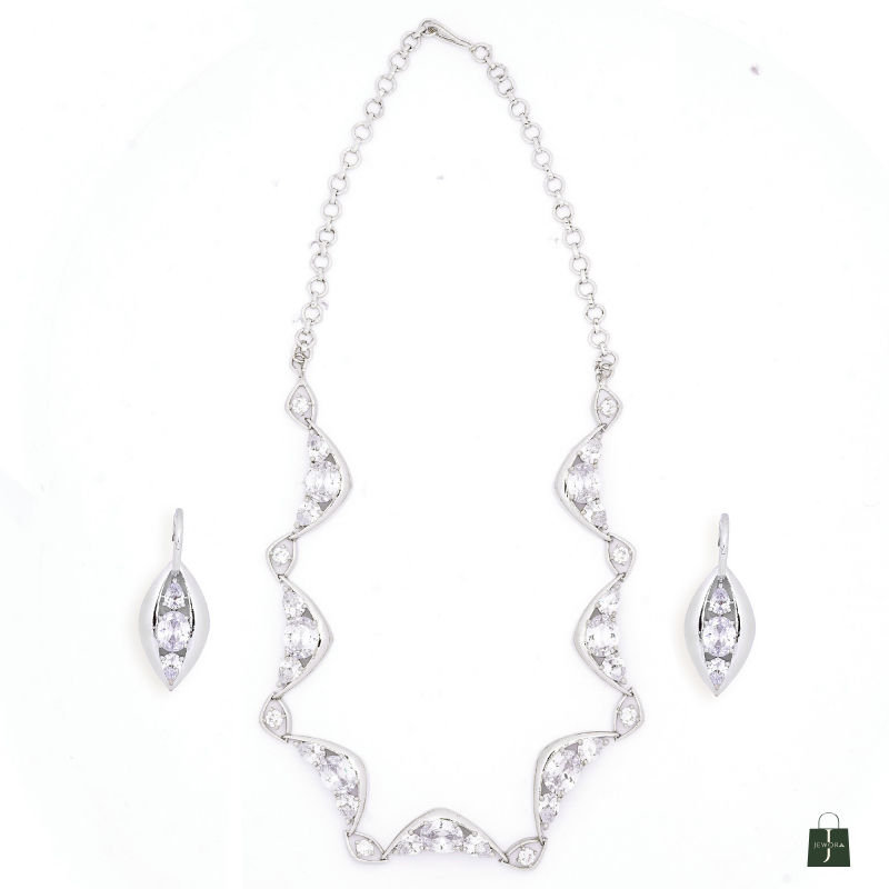 This Rhodium polished American diamond luxurious shine necklace set made with exquisite craftsmanship paired with matching earrings, This design adds a touch of elegance to any outfit