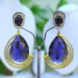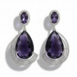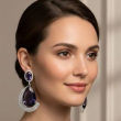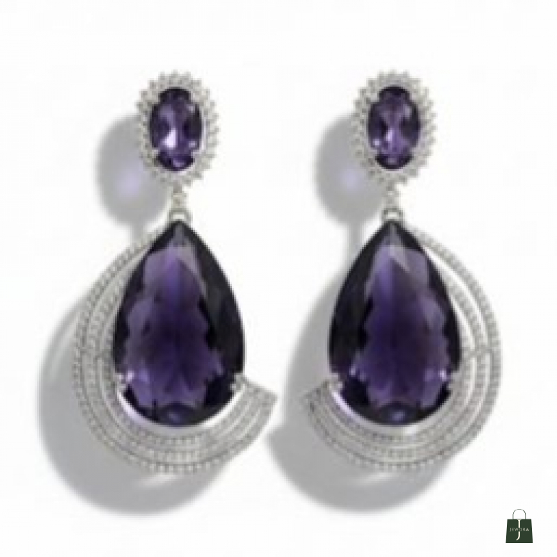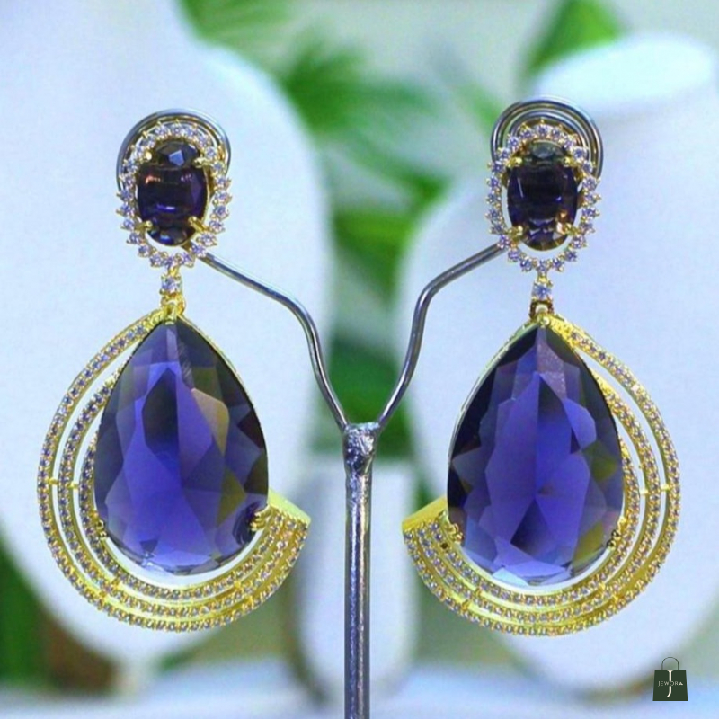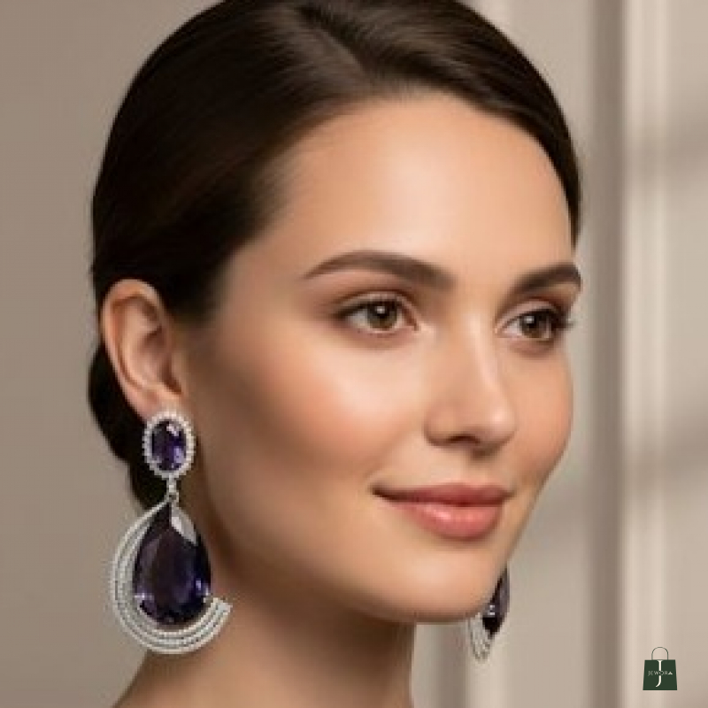 Elevate your evening ensemble with a touch of celestial royalty. These striking statement earrings feature mesmerizing, deep-violet center stones—reminiscent of a midnight sky—cut into a sophisticated teardrop shape. Each jewel is cradled by a shimmering "orbit" of tiered, silver-toned arcs pavé-set with brilliant crystals. The design seamlessly blends classic regal aesthetics with a modern, architectural silhouette.