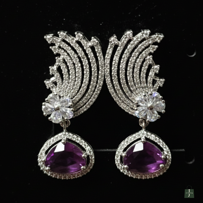 Design: A dramatic, winged/fan-shaped top studded with brilliant micro-pave Cubic Zirconia (CZ) stones, creating a dazzling cascade effect.