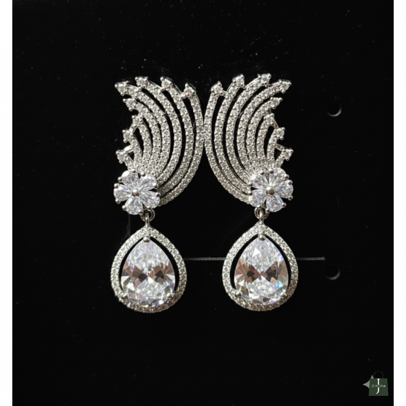 Design: A dramatic, winged/fan-shaped top studded with brilliant micro-pave Cubic Zirconia (CZ) stones, creating a dazzling cascade effect.