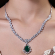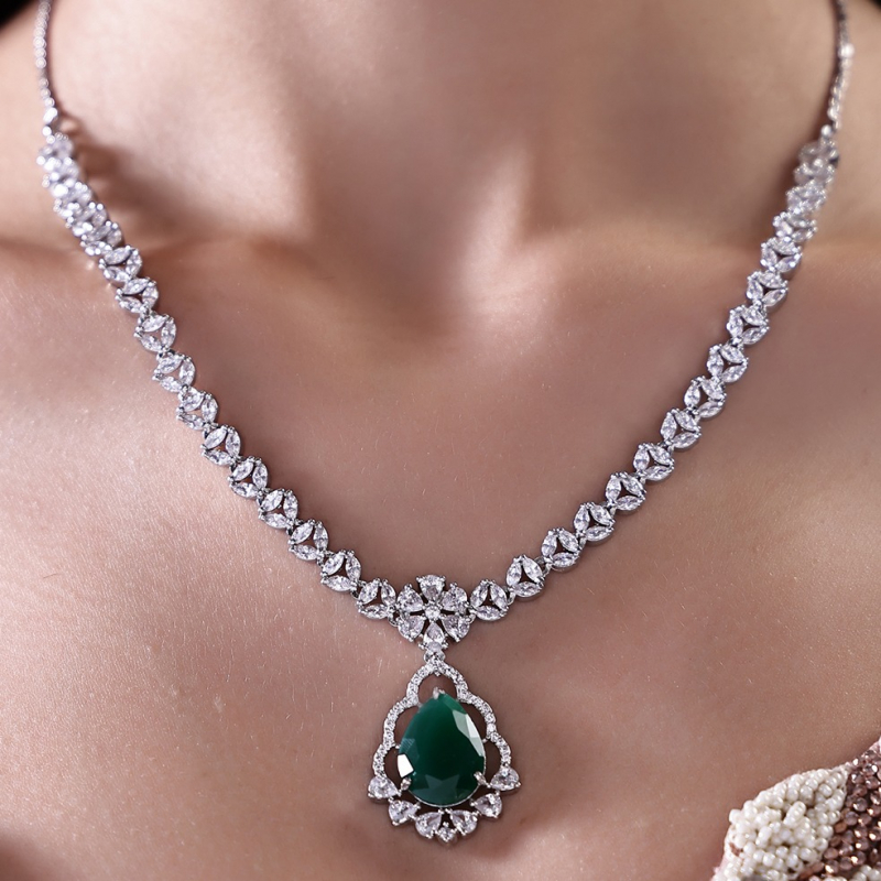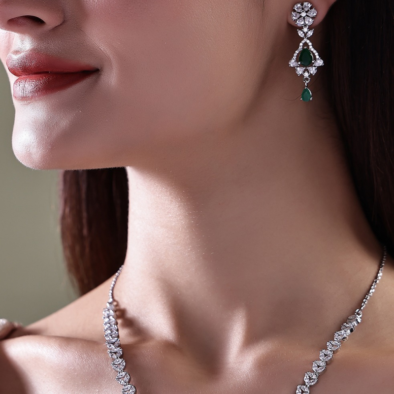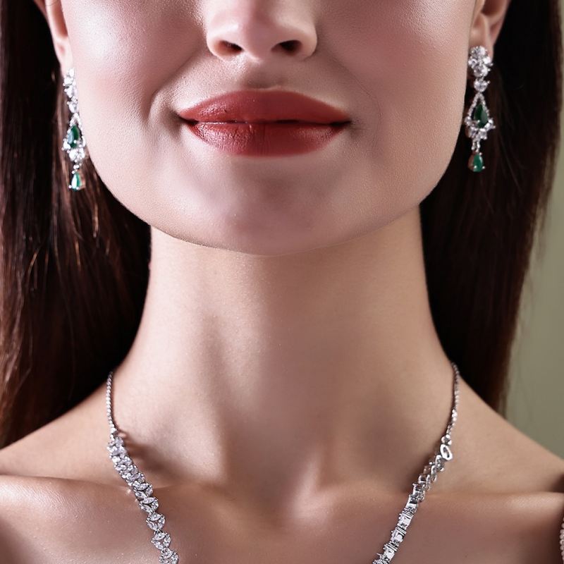 Make a statement of sophistication with this stunning emerald green necklace set, paired with matching earrings for a complete, luxurious look. Featuring rich emerald-toned stones accented with sparkling white crystals, this set exudes elegance and timeless charm.