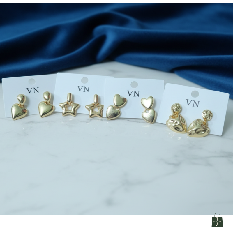 Elevate your accessory game with this charming collection of four anti tarnish distinct pairs of gold-plated dangle earrings. Each pair is beautifully crafted, offering versatile styles perfect for daily wear or special occasions. This set makes an excellent gift or a wonderful addition to your own jewelry box.