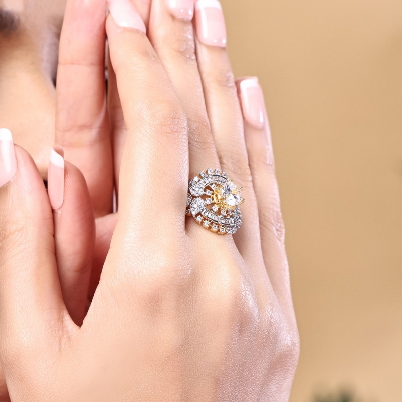 Exude elegance and sophistication with this stunning Royal White Diamond Ring. Designed to capture timeless beauty, this ring features dazzling white stones that shimmer with every movement. The finely crafted band with a smooth, polished finish enhances its luxurious appeal, making it a perfect blend of grace and glamour. Whether worn as a statement piece or paired with other accessories, this ring adds a royal touch to any look. Ideal for special occasions, parties, or everyday elegance, it is a must-have for those who love classic and refined style.