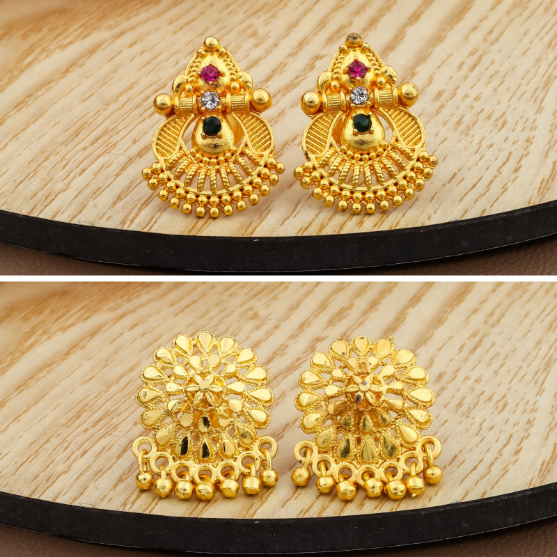 Celebrate traditional craftsmanship with this stylish gold-tone earrings combo set for women. The set includes 5 elegant pairs designed with intricate detailing and decorative patterns that reflect classic Indian jewelry aesthetics. Each pair is carefully crafted with a smooth gold polish that gives it a rich and sophisticated finish. The addition of sparkling stones enhances the beauty of the earrings while maintaining a balanced and elegant look. Lightweight and comfortable, these earrings can be worn for extended periods without discomfort. Perfect for weddings, festive celebrations, parties, and everyday wear, this versatile combo set offers multiple styling options.