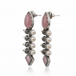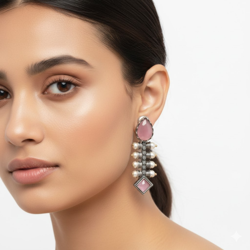 Enhance your ethnic look with these stunning oxidised silver plated earrings, designed with a unique blend of traditional detailing and modern charm. The earrings feature a soft pink teardrop stone at the top, adorned with intricate metalwork and lined with elegant pearl beads along the sides. A matching pink square stone at the bottom completes the design, adding balance and sophistication. Lightweight and skin-friendly, these earrings make the perfect accessory for festivals, celebrations, and daily glam.