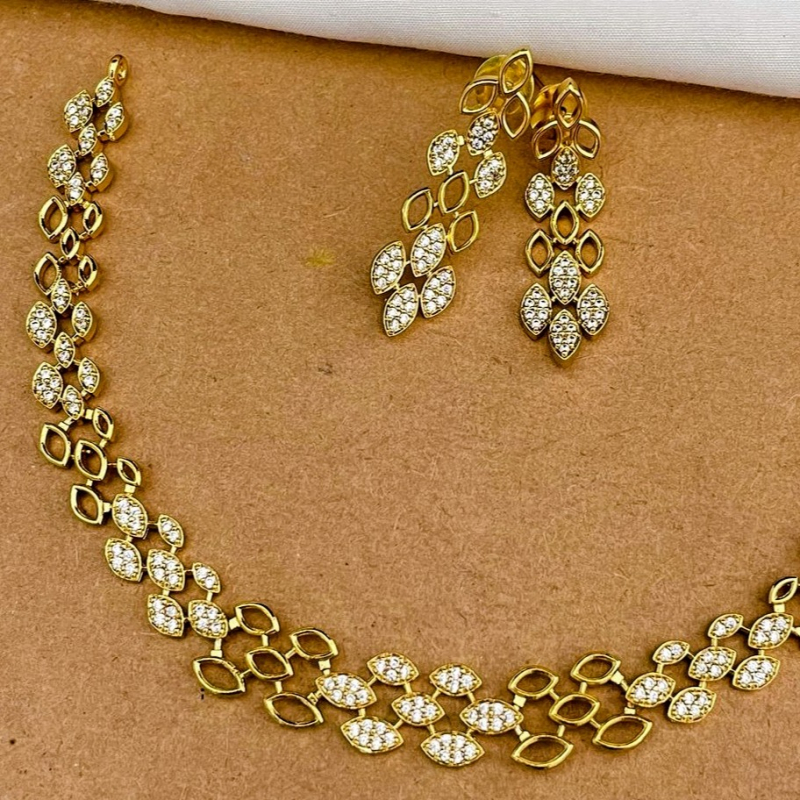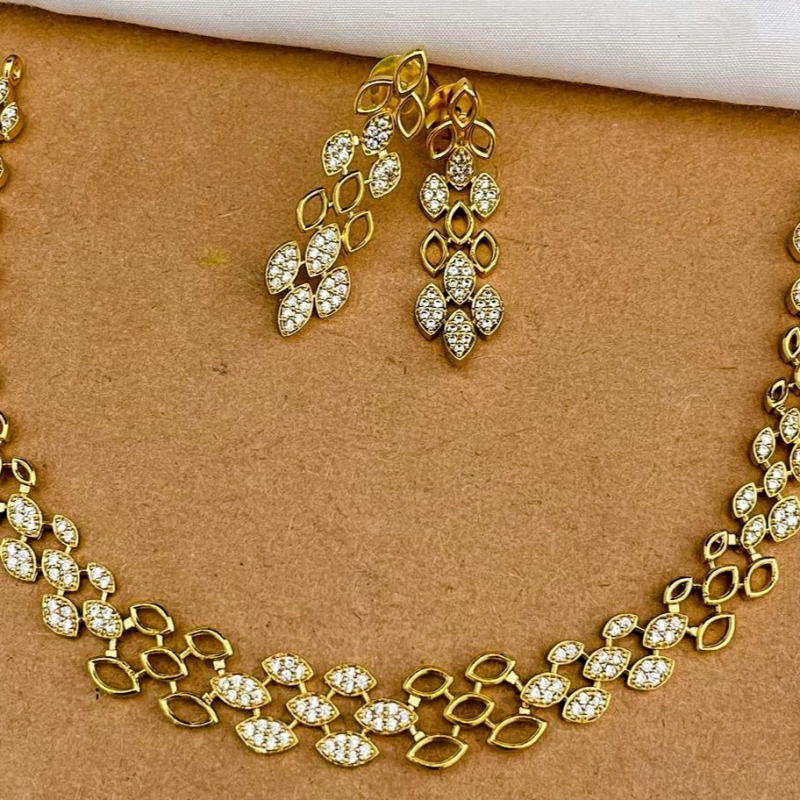 Elevate Your Elegance with this Designer CZ AD Necklace Set,crafted in a radiant Gold-Plated Finish and adorned with Sparkling American Diamond(CZ Stones) . Paired with Easy wear Matching Earring add a glamorous touch,making this set a perfect one for parties,weddings,reception and festivities.It offers the brilliance of fine jewellery at Affordable Price