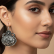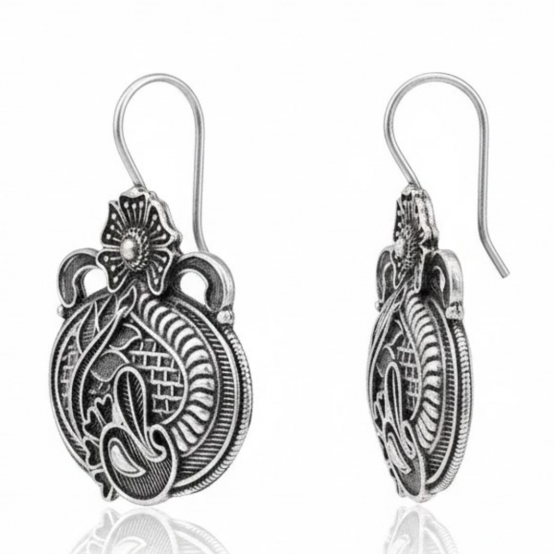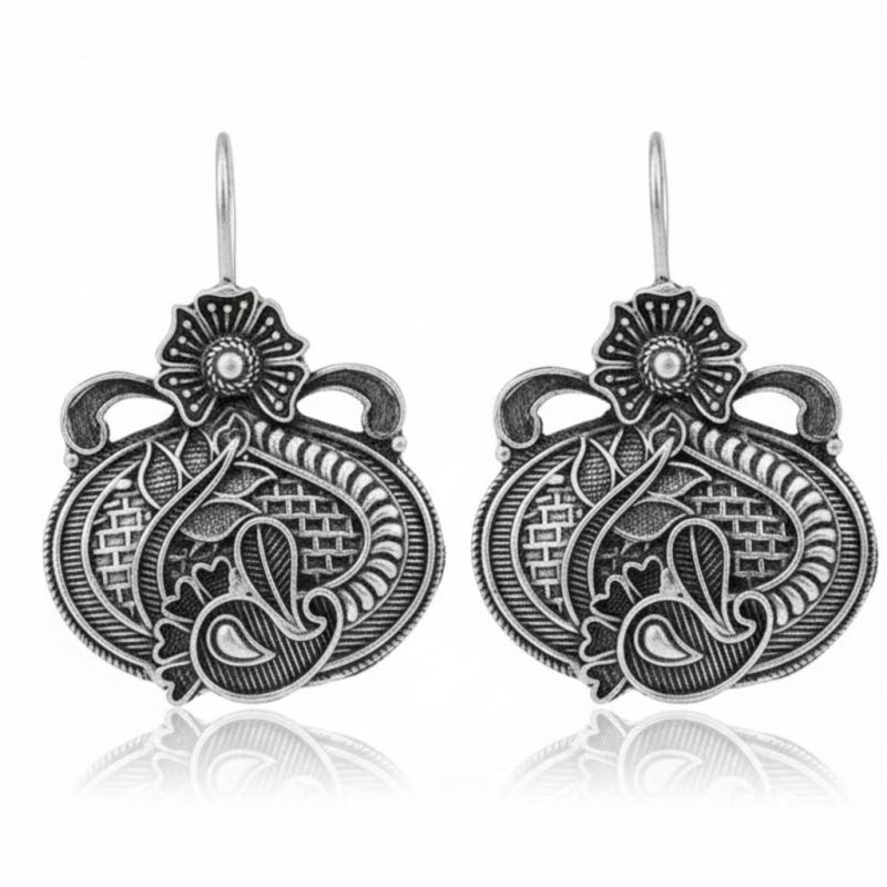 Enhance your ethnic look with these beautifully crafted oxidised silver-plated floral paisley dangler earrings. Designed with exquisite detailing, the earrings feature a blend of floral patterns, woven textures, and traditional paisley motifs that add depth and charm to the design. The antique finish gives them a timeless handcrafted appeal, making them a versatile addition to your jewellery collection.