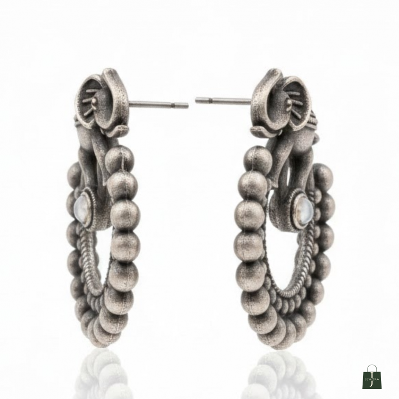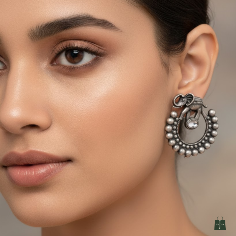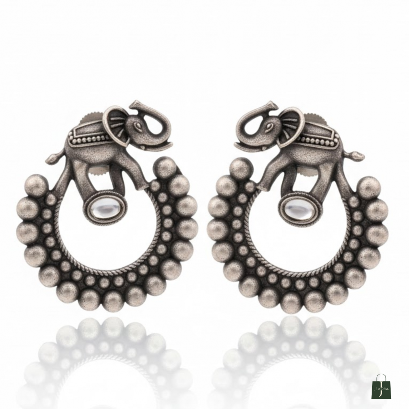 Add a touch of tradition and artistry to your look with these stunning oxidised silver elephant dangler earrings. Each earring showcases a finely detailed elephant figure standing atop a textured circular base decorated with antique silver beads. A mirror-finish centre accent adds sparkle and elegance to the design. Lightweight, comfortable, and eye-catching, these earrings pair beautifully with sarees, lehengas, kurtis, anarkalis, and Indo-western outfits—making them ideal for festivals, weddings, temple visits, and special occasions.