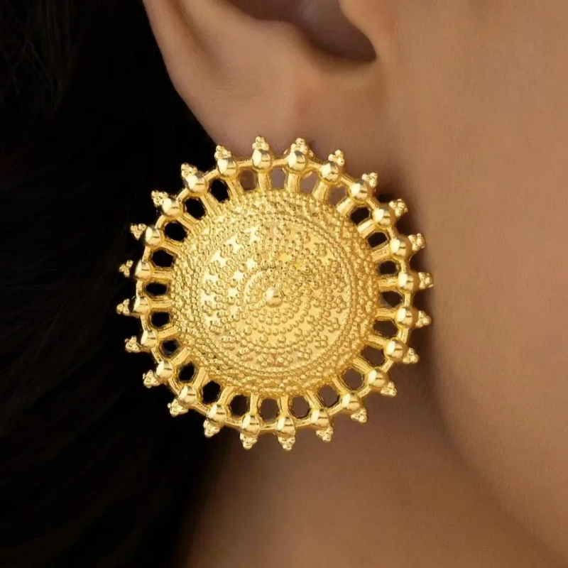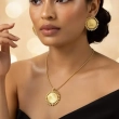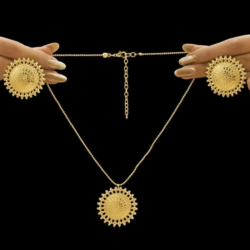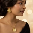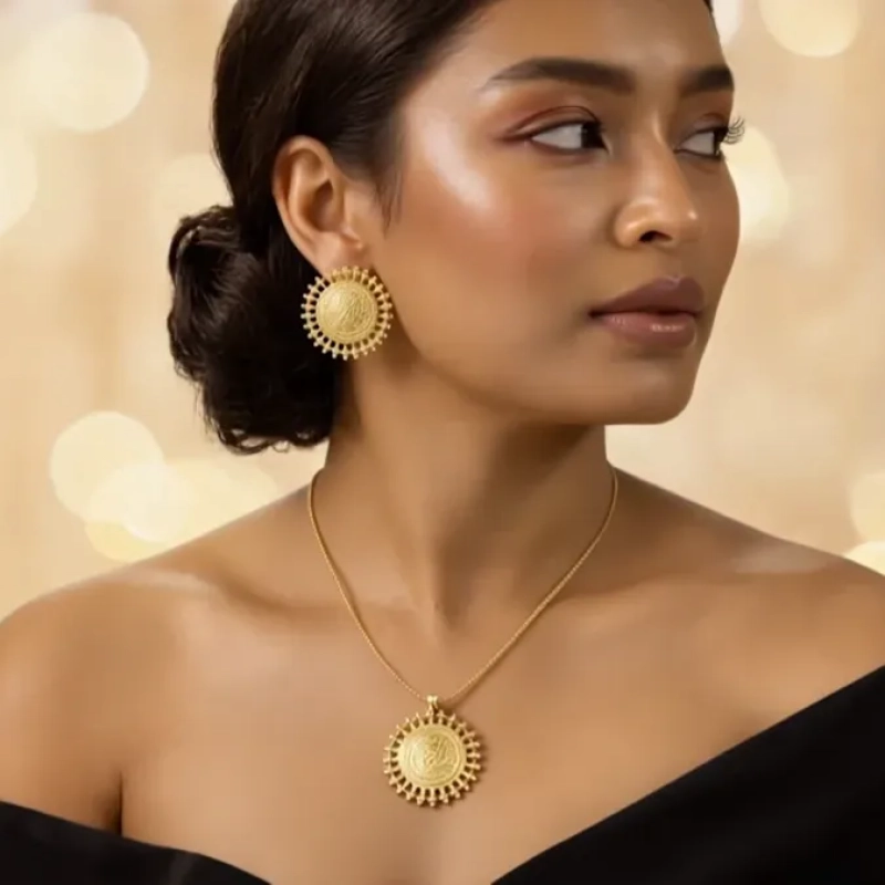 Radiating warmth and heritage charm, Ushve’s Sunburst Ethnic Necklace Set is inspired by the timeless symbolism of the sun. The finely detailed pendant features a striking sun motif that captures light beautifully, creating a radiant focal point along the neckline. Suspended from a sleek gold-tone chain, the pendant blends traditional artistry with a clean modern touch. The matching sun-inspired stud earrings echo the same intricate detailing, completing the coordinated look with graceful balance. Lightweight and comfortable for extended wear, this jewellery set is perfect for festive occasions, celebrations, and elegant everyday styling. Crafted with Ushve’s signature blend of heritage inspiration and contemporary design, it adds a radiant cultural elegance to any outfit.
