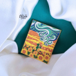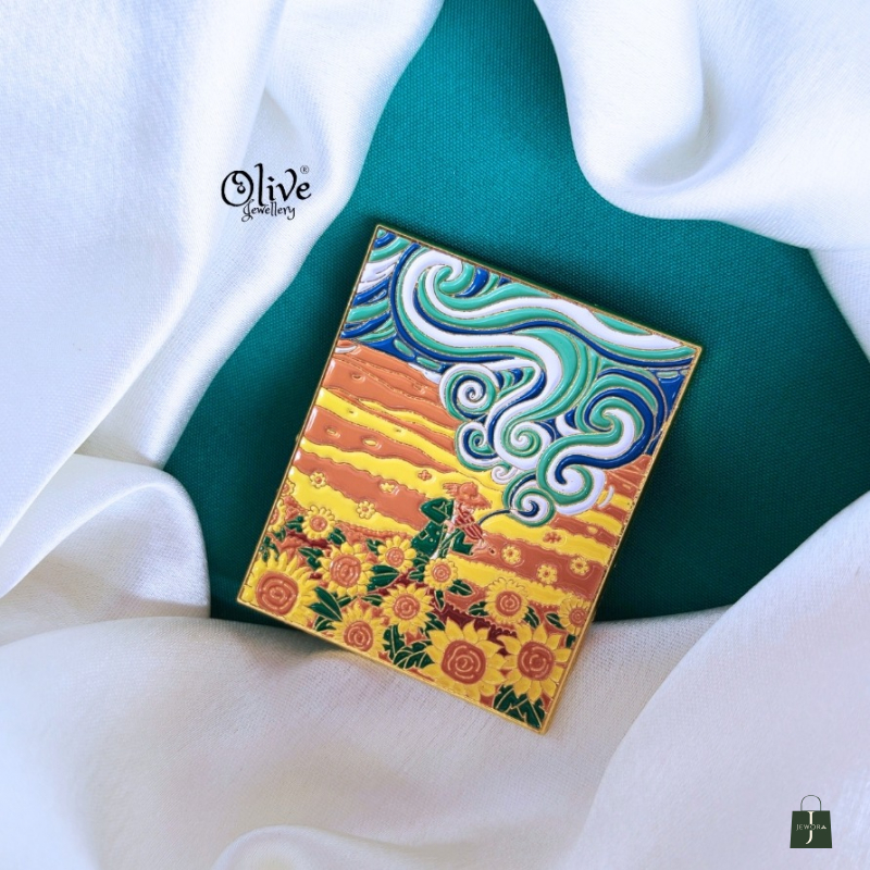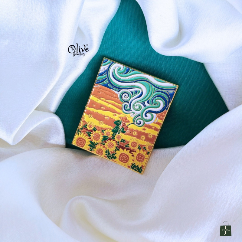 Add a touch of wearable art to your outfit with the Sunset Garden Art Brooch Pin. This beautifully crafted square brooch features a hand-painted enamel design inspired by a dreamy landscape—golden sunflower fields, flowing sky waves, and warm sunset hues. Framed with a sleek gold-polished border, this brooch is perfect for those who love artistic, statement accessories.