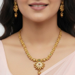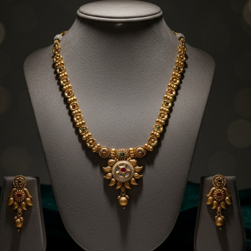 Embrace divine elegance with this beautifully crafted temple-inspired necklace set designed in rich antique gold polish. The necklace features a sequence of intricately carved gold beads leading to a grand circular pendant inspired by traditional Surya motifs. The centerpiece is adorned with white kundan stones, accented with ruby pink and emerald green highlights for a regal finish. Delicate gold bead danglings enhance the heritage appeal. Paired with matching traditional stud earrings, this set is ideal for bridal and festive occasions.