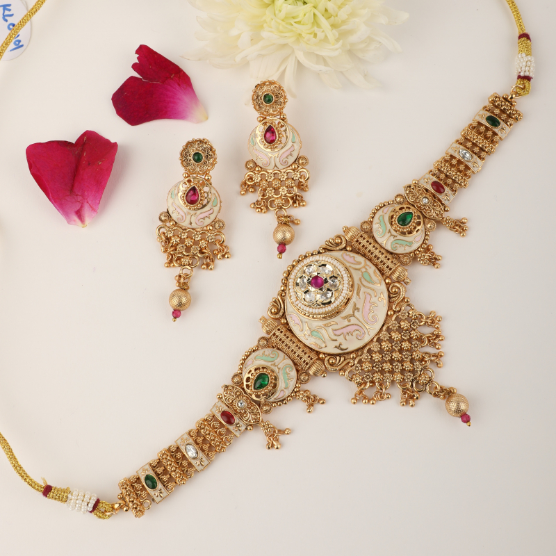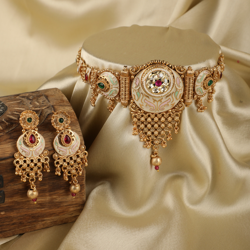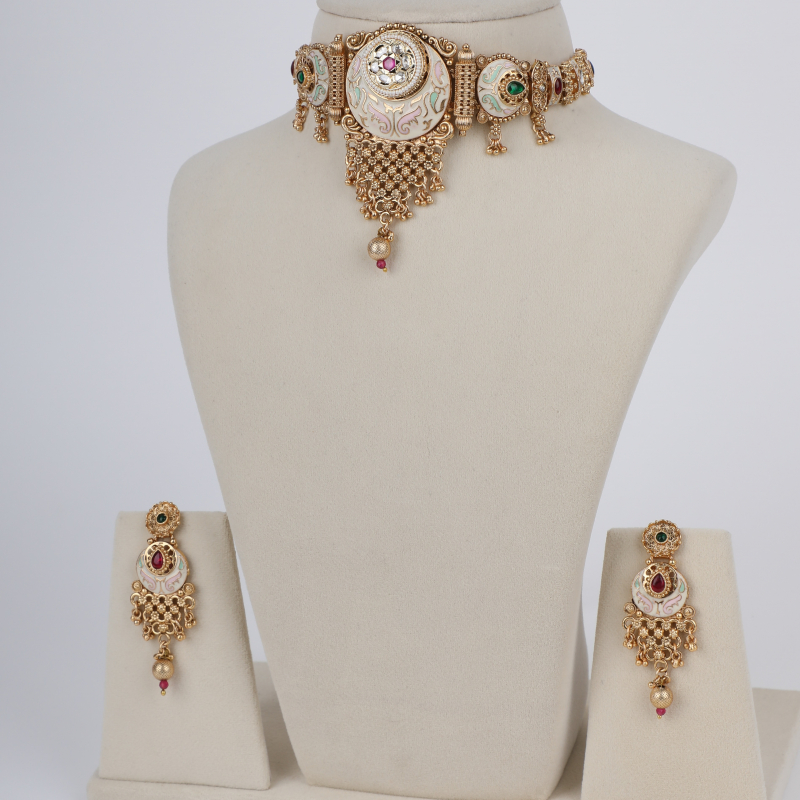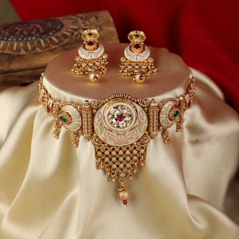 Designed to sit gracefully along the neckline, this choker set embodies heritage craftsmanship with a regal presence, making it a standout addition to any traditional jewellery collection.
