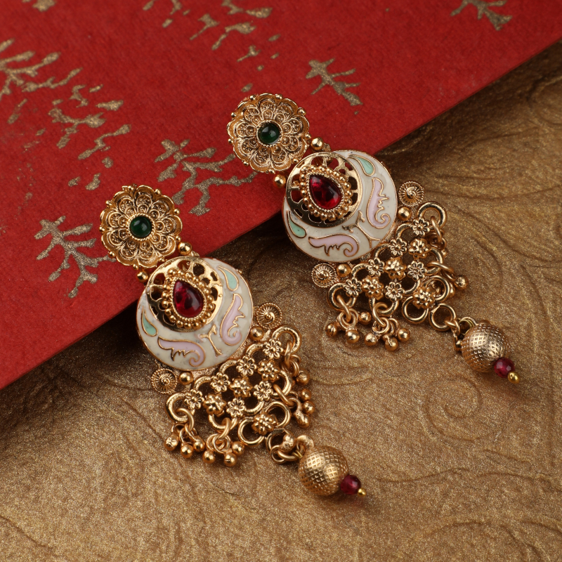 At the center, a statement medallion is beautifully finished with cascading gold bead tassels, creating elegant movement and a rich, ceremonial appeal. The matching earrings mirror the choker’s design, featuring layered Kundan detailing and fine dangling elements that complete the set with perfect harmony.