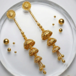 Gracefully elongated and richly detailed, the Svarna Cascade Layered Jhumki features a textured floral stud leading to beautifully stacked dome layers adorned with subtle stone accents. The delicate dangling bead chains add elegant movement, creating a refined yet festive look—perfect for weddings, traditional gatherings, and statement styling.