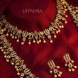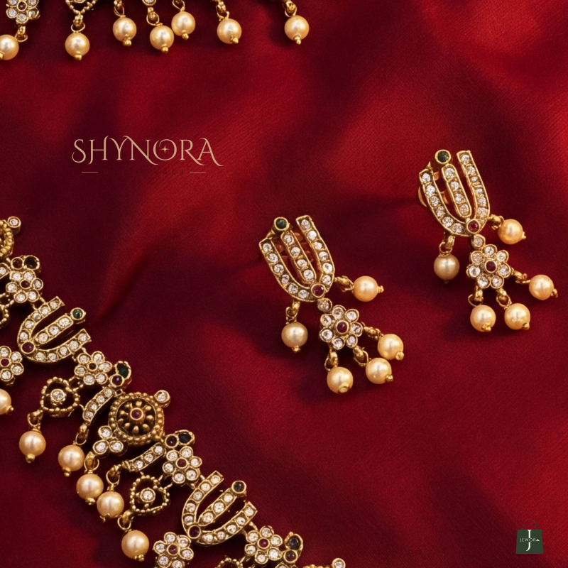 The layered design creates a regal silhouette, while the delicate pearl hangings add soft movement and charm. Matching earrings complete the set, making it a perfect choice for weddings, temple ceremonies, festive celebrations, and heritage ensembles.
