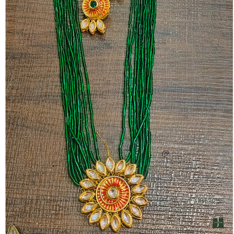 A beautifully crafted polki necklace that pairs seamlessly with one-piece outfits and Indo-Western styles. Its timeless design and delicate green seed bead sparkle make it a versatile accessory—ideal for dressing up contemporary silhouettes with a hint of traditional charm.