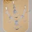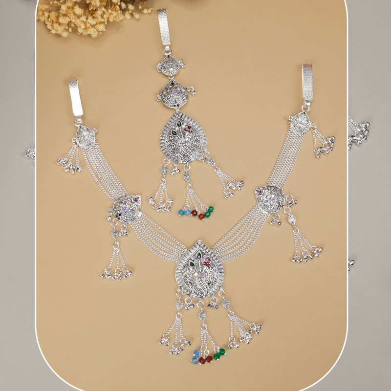 This elegant oxidised silver kamarbandh features a beautifully carved leaf-inspired centerpiece that highlights traditional Indian craftsmanship. The intricate detailing on the leaf motif creates a graceful and artistic appeal. Multiple delicate chain strands extend on both sides, forming a layered and stylish waist accessory. Dangling tassel chains with multicolor bead drops add vibrant movement and charm. Perfect for pairing with sarees, lehengas, and festive outfits, this kamarbandh enhances the waistline and adds a rich ethnic elegance to any traditional look.
