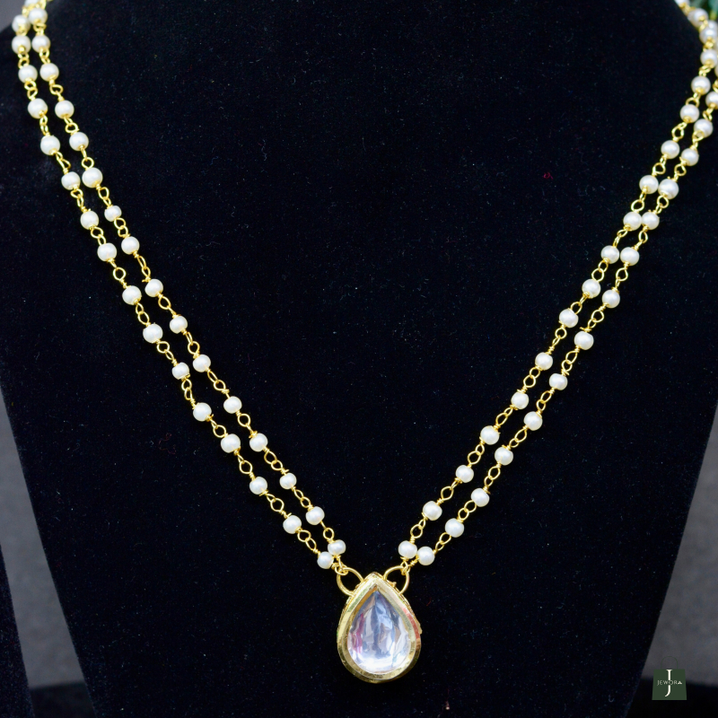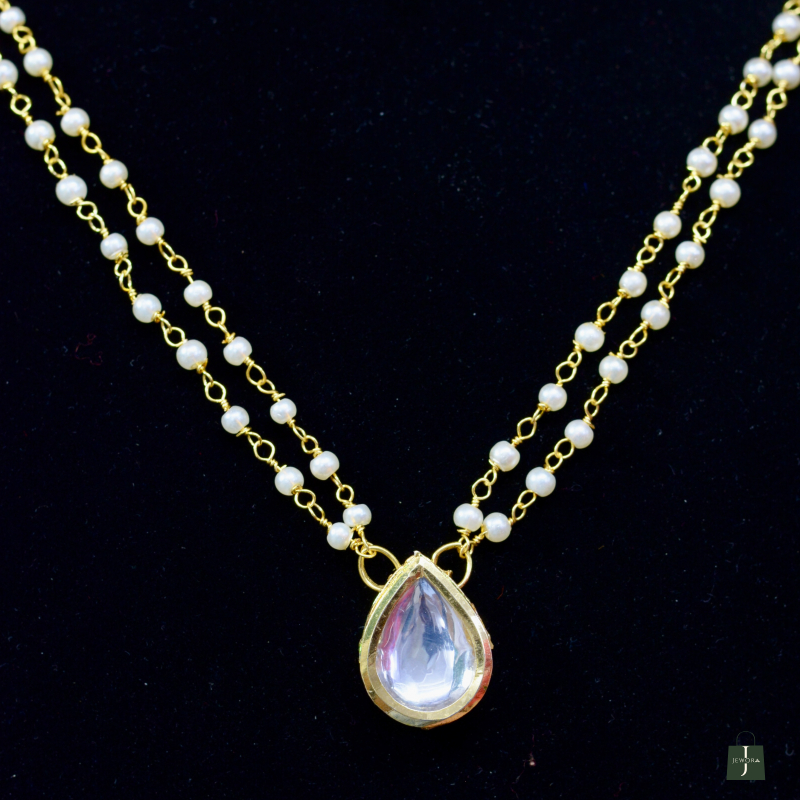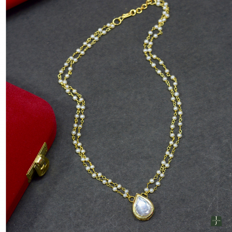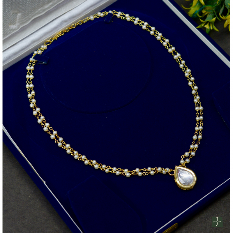 Featuring graceful teardrop-shaped Kundan stones framed by pearls, this necklace offers timeless charm and balanced sparkle. The elegant silhouette and fine finish make it perfect for weddings, receptions, and festive styling with a premium appearance and comfortable wear.