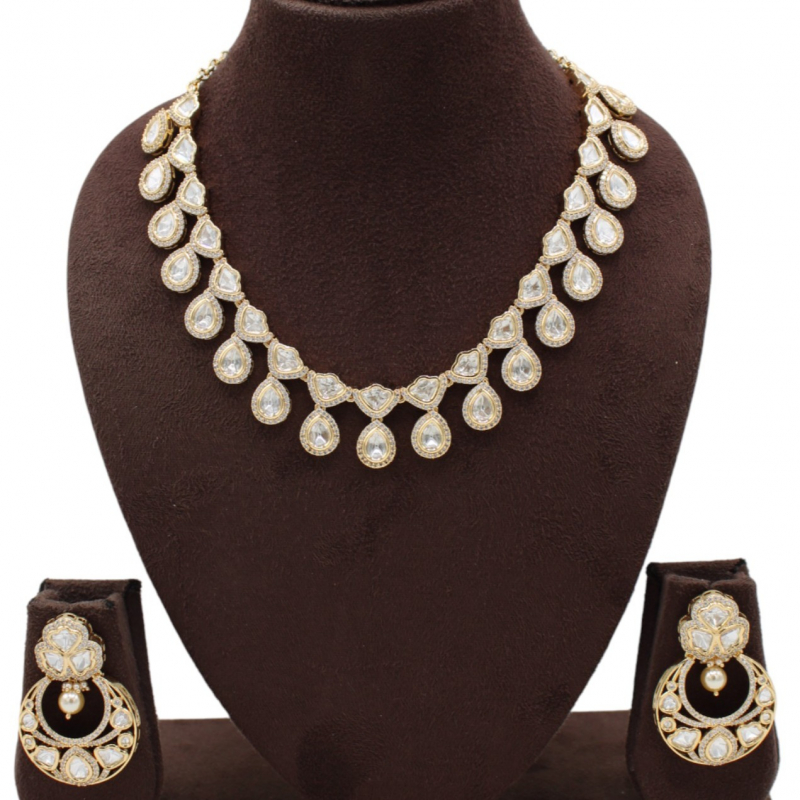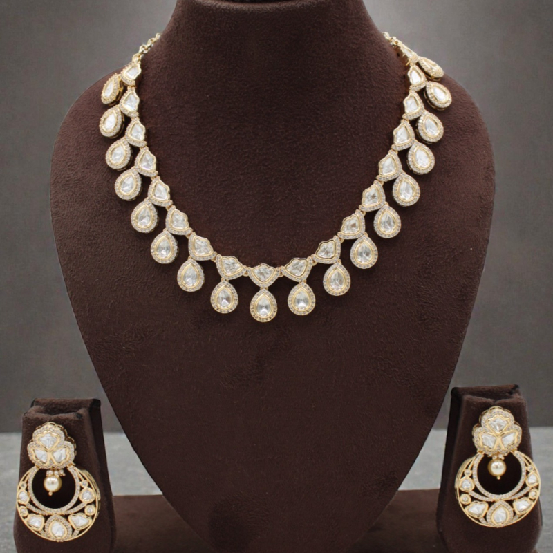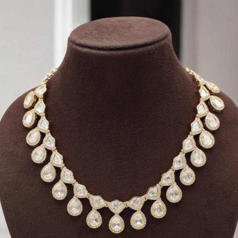 Exude sophistication with this stunning pear-shaped Kundan necklace set, designed to capture timeless royal elegance. The necklace features a graceful arrangement of teardrop (pear-cut) uncut stones, each delicately framed in a fine gold bezel setting. The symmetrical drop pattern creates a refined, flowing silhouette that beautifully enhances the neckline.