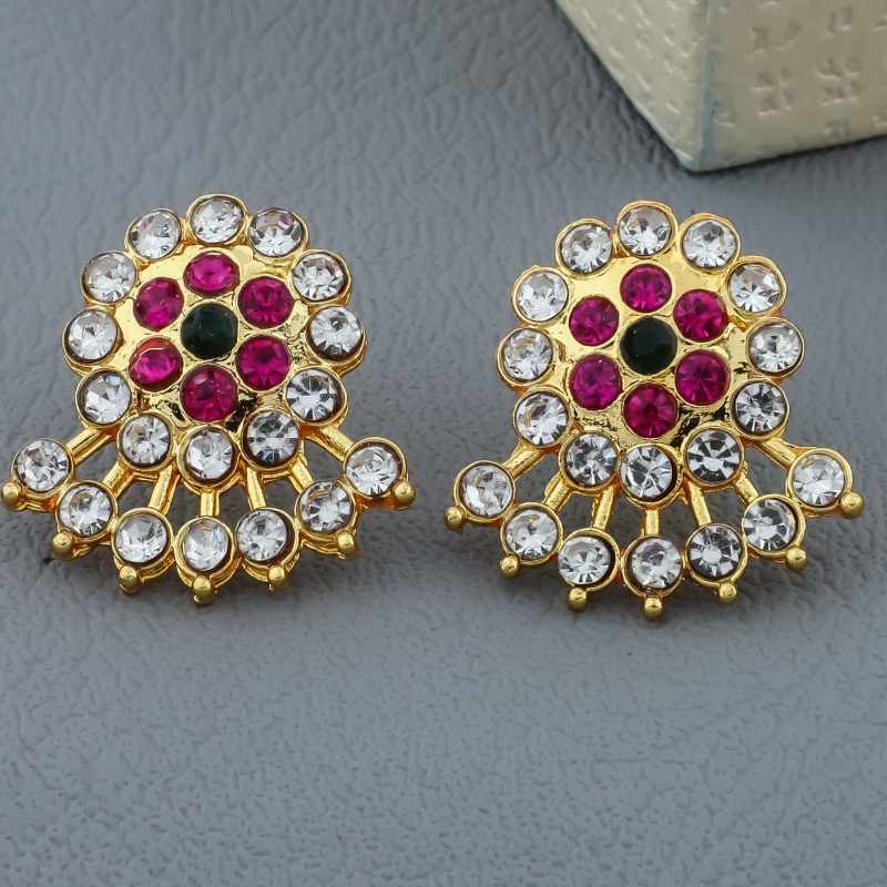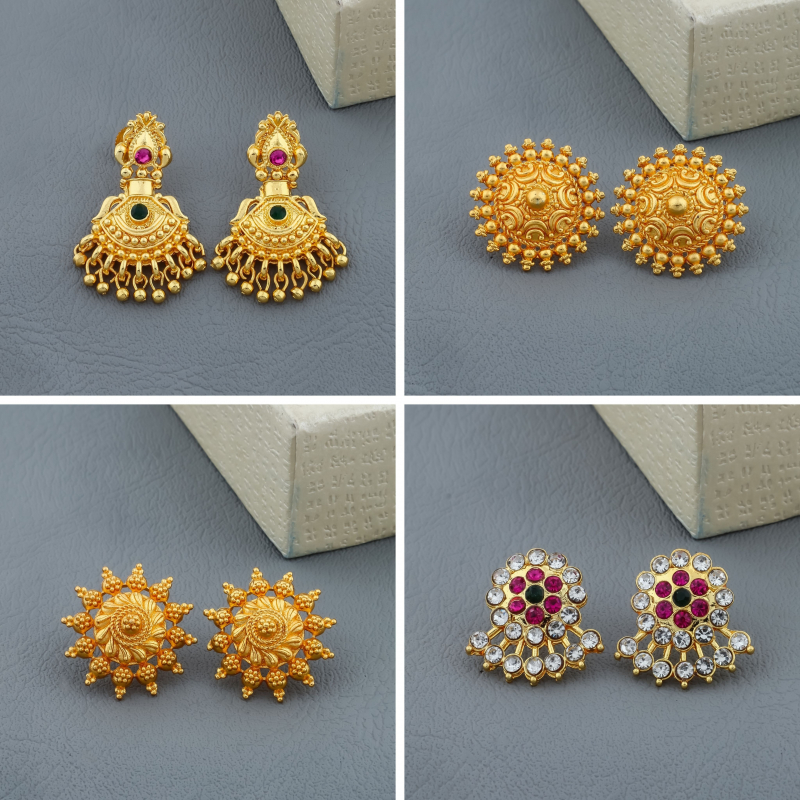 Upgrade your jewellery collection with this beautiful 4-pair earrings combo set featuring a mix of traditional temple drops and elegant designer stud earrings. Crafted with a rich antique gold-tone finish, each pair showcases intricate detailing and vibrant stones that enhance its traditional charm.