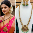 Celebrate timeless South Indian tradition with this exquisite Temple Heritage Lakshmi Pendant Long Necklace Set. Inspired by classic temple jewellery designs, this long necklace features beautifully crafted antique gold beads that create a rich and traditional look. The highlight of the set is the intricately detailed temple-style pendant, adorned with elegant carvings and vibrant red and green stones that enhance its royal appeal.