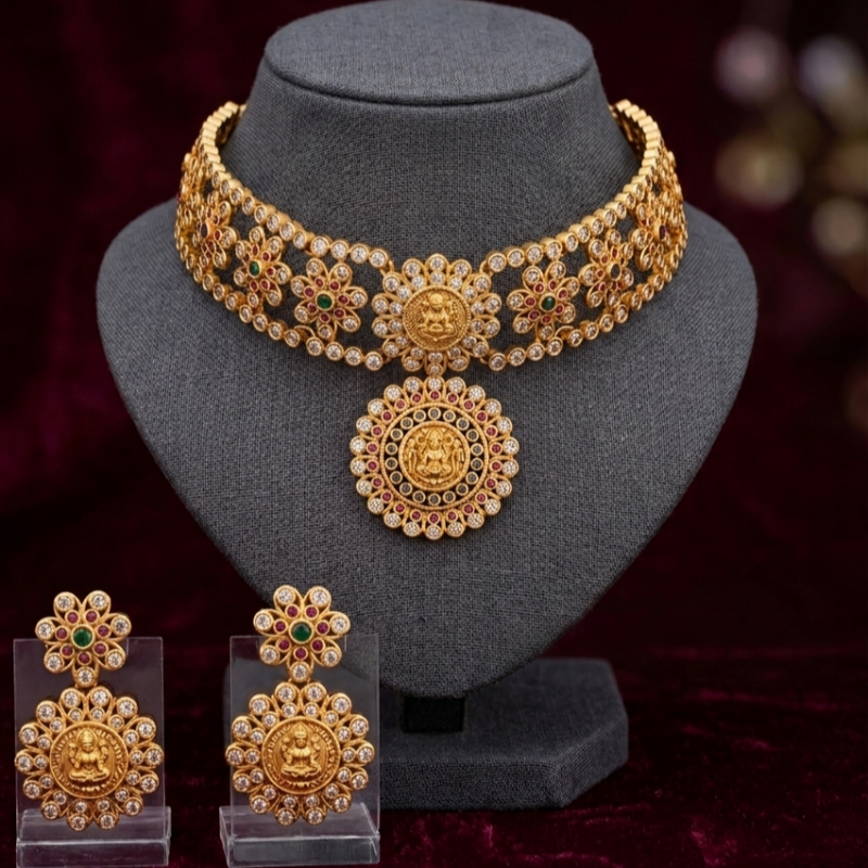 Stunning matte gold choker set featuring intricate filigree floral motifs with sparkling stone accents. The centerpiece showcases a detailed medallion pendant that hangs elegantly from the necklace, matched with coordinating drop earrings that mirror the pendant design. Ideal for traditional or contemporary styling, this set adds regal sophistication to any outfit.