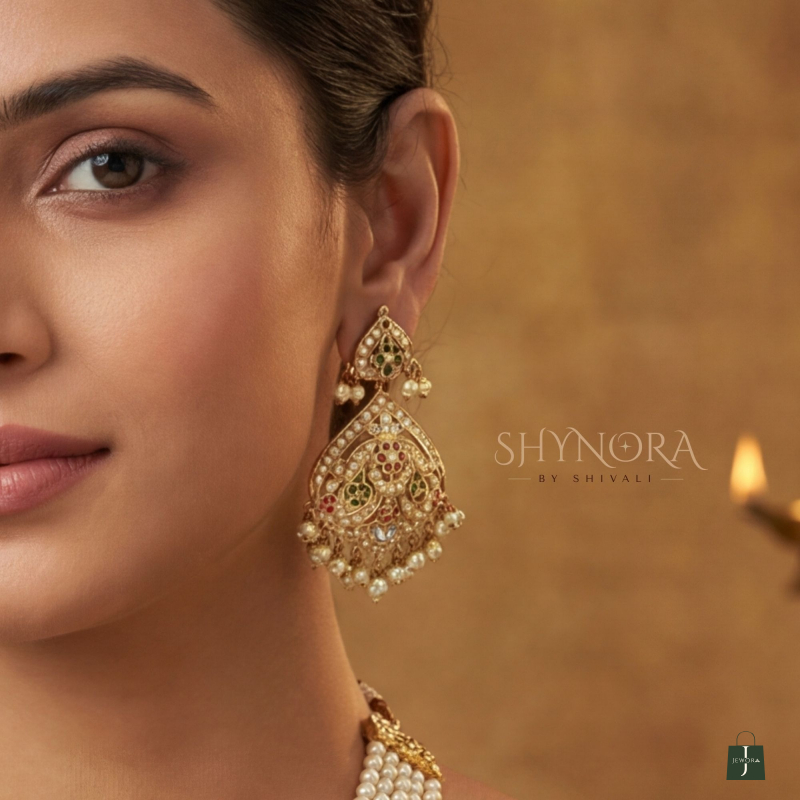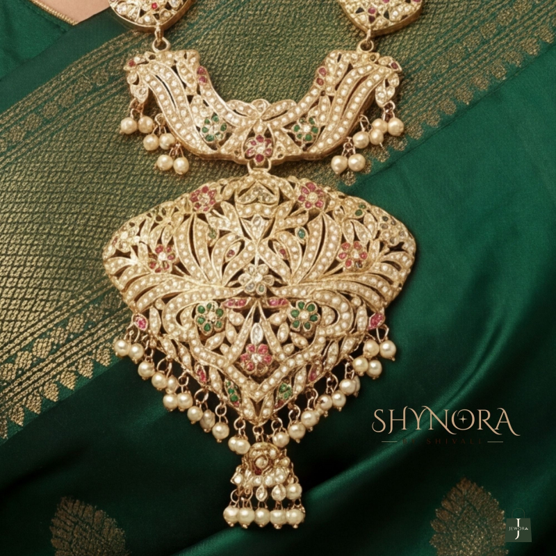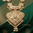 The grand statement pendant showcases traditional goddess and floral carvings, embellished with ruby and emerald stones for a rich royal touch. Finished with delicate pearl danglers, the design exudes divine elegance and cultural charm. Paired with matching temple earrings, this set is perfect for bridal and festive occasions.