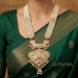 Presenting a majestic Temple Pearl Haar Set, crafted for brides who love timeless South Indian heritage jewellery. This long haar features multiple strands of fine pearls, accentuated with intricately carved temple motifs in antique gold polish.