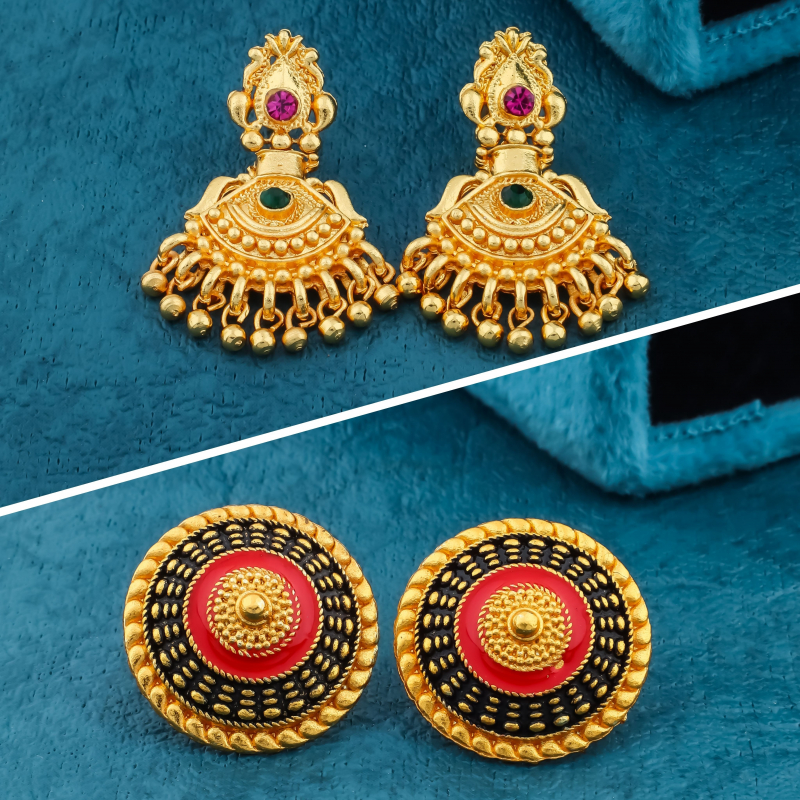 Add timeless charm to your jewelry collection with this beautiful combo of 2 traditional stud earrings featuring intricate circular designs and elegant gold-tone finish. The set includes sunburst-inspired studs and floral filigree pattern studs, crafted with fine detailing that reflects classic ethnic craftsmanship.