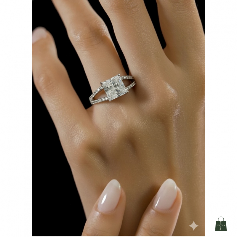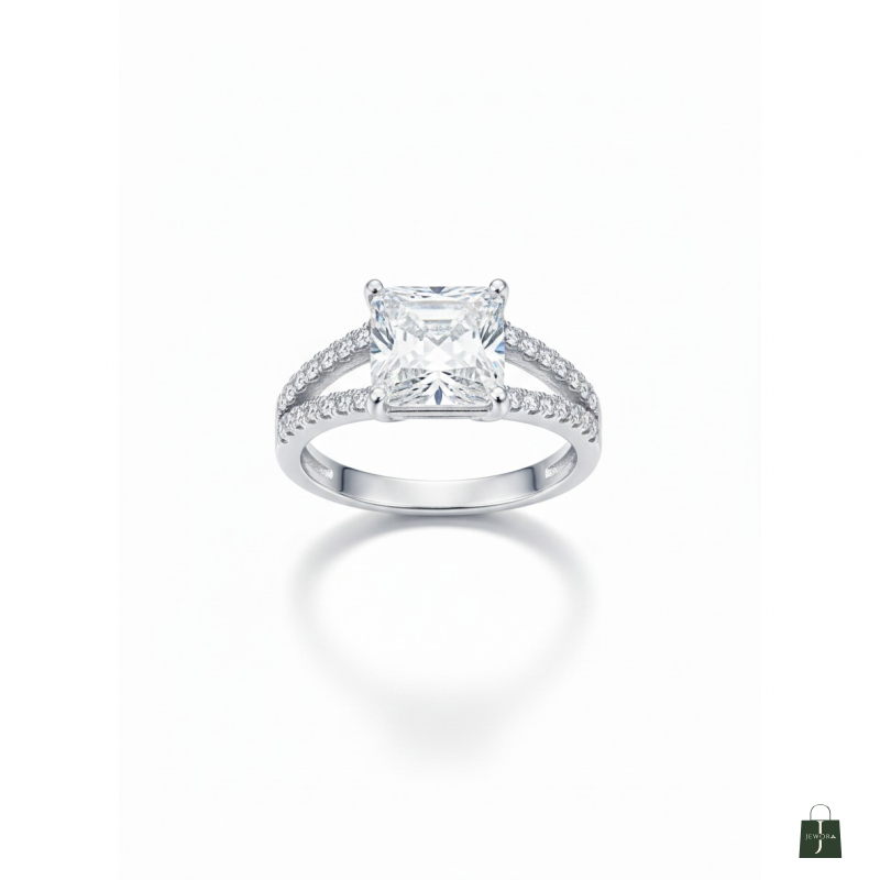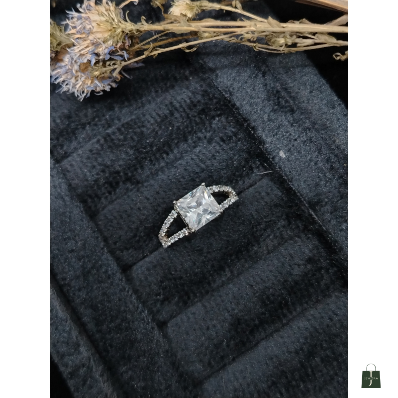 The Aura Ring is a modern masterpiece that effortlessly captures light and attention. At its heart is a brilliant Princess-cut (square) simulated diamond or cubic zirconia, securely held in a classic four-prong setting to maximize its dazzling fire. The centerpiece is elegantly framed by a unique split-shank band, which separates at the shoulders and is meticulously adorned with a double row of sparkling micro-pavé accent stones. Crafted from polished sterling silver, the design ensures a continuous, luxurious line of brilliance. This ring perfectly balances a bold central stone with delicate side detailing, making it an ideal choice for a contemporary engagement ring, a luxurious statement piece, or a stunning anniversary gift.