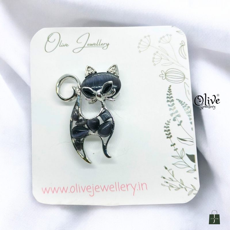 Add a playful yet elegant accent to your outfit with this Midnight Cat Stone Brooch Pin. Designed in a sleek sitting-cat silhouette, this brooch features glossy dark-toned stones set in a polished silver-tone frame. The curled tail and expressive eyes add character, making it a perfect statement accessory for cat lovers and fashion enthusiasts alike. Ideal for jackets, scarves, dresses, handbags, or gifting.