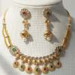 Embrace feminine elegance with the Gilded Blossom Droplet Set, a masterpiece featuring a delicate scalloped design. This antique gold-tone choker is adorned with intricate floral medallions and vibrant ruby and emerald-colored stones. Finished with graceful golden droplets and matching Jhumka earrings, it is the perfect choice for weddings and festive celebrations.