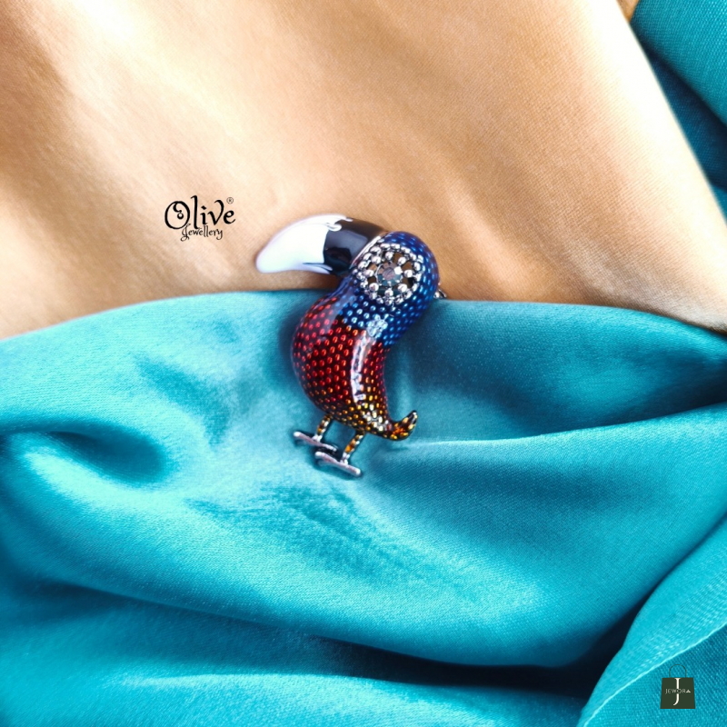 This eye-catching brooch features a beautifully crafted toucan bird design finished in rich multicolour enamel tones. Accented with a sparkling crystal eye and a glossy white beak, the piece brings a playful yet elegant charm to your outfit. Perfect for adding a pop of color to dresses, scarves, blazers, sarees, or shawls, this brooch is ideal for those who love bold, artistic accessories inspired by nature and wildlife.