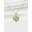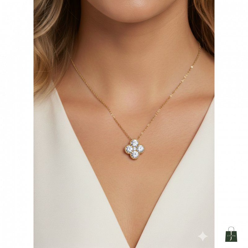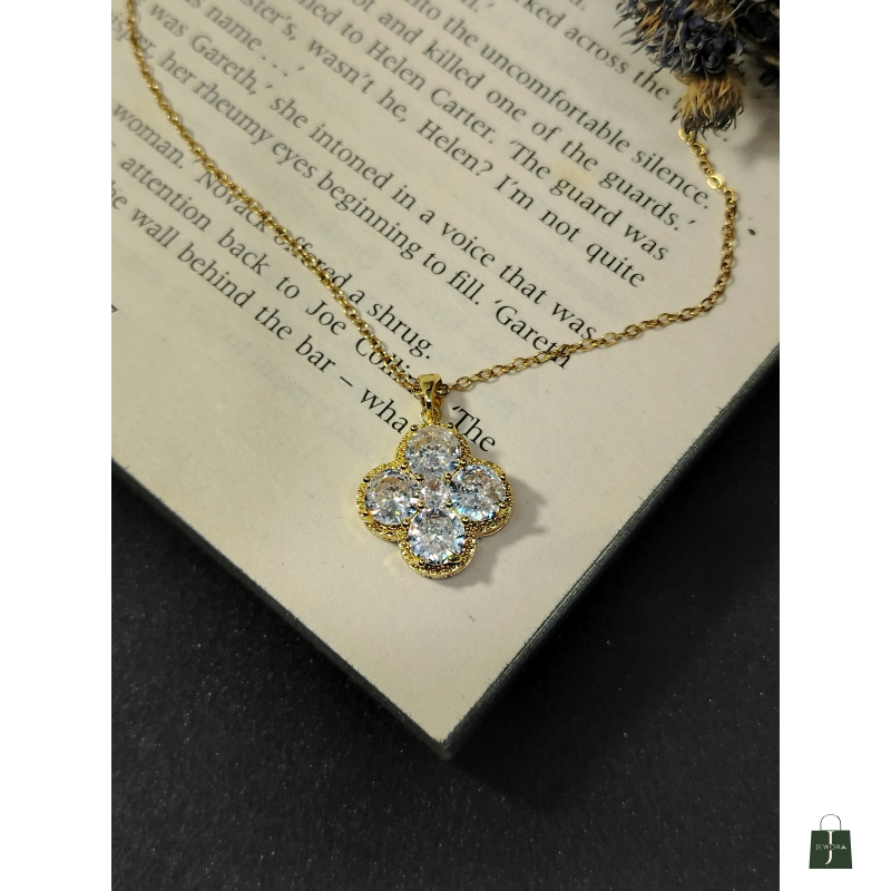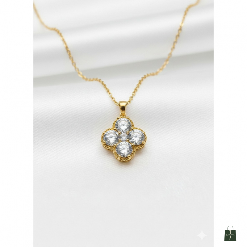 Wear a symbol of luck and elegance with The Clover Bloom Pendant. This exquisite necklace features a classic four-leaf clover (quatrefoil) design, formed by four brilliant white stones set closely together to maximize sparkle. The stones are framed by a delicate, rich yellow gold-tone setting that features beautiful beaded or rope-like detailing around the edges, adding a touch of vintage charm and texture. Suspended from a slender gold chain, this pendant is perfect for everyday wear, layering with other necklaces, or as a meaningful gift symbolizing good fortune and enduring style.