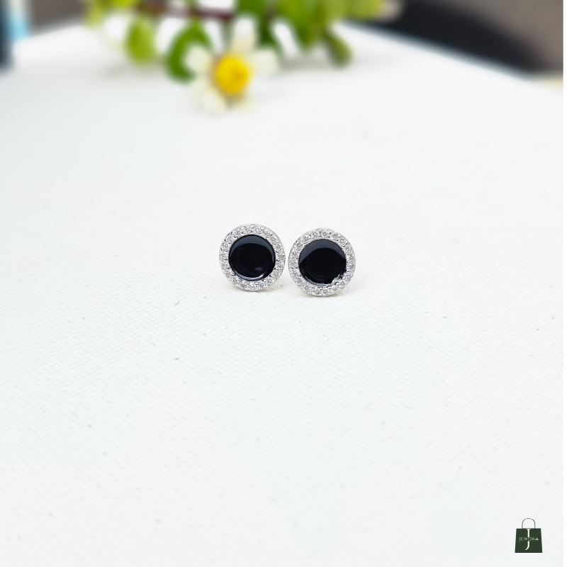 Make a modern statement with these chic stud earrings, featuring a bold contrast of polished black enamel and brilliant pav stones. Their unique fan design adds a touch of dynamic, contemporary elegance to any look.