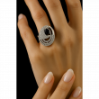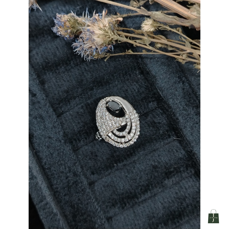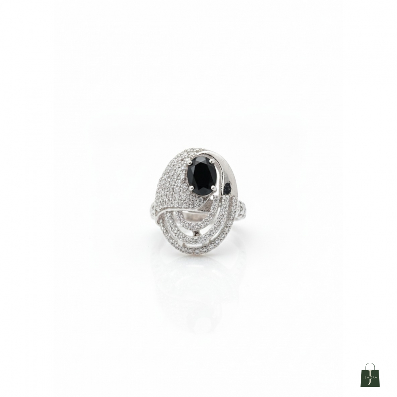 Make a bold, artistic statement with The Eclipse Ring. This captivating piece features a sleek oval black stone (such as black onyx or black sapphire), which serves as a dramatic, dark focus point. The black stone is beautifully contrasted by sweeping, asymmetrical curves of brilliant white stones set in micro-pavé. These curved lines wrap around the centerpiece, creating a dynamic, almost orbital or wave-like effect. Crafted in polished white metal, the ring is a celebration of modern, architectural design and striking contrast. It is the perfect accessory for the individual who seeks unique, high-fashion jewelry that breaks from tradition.